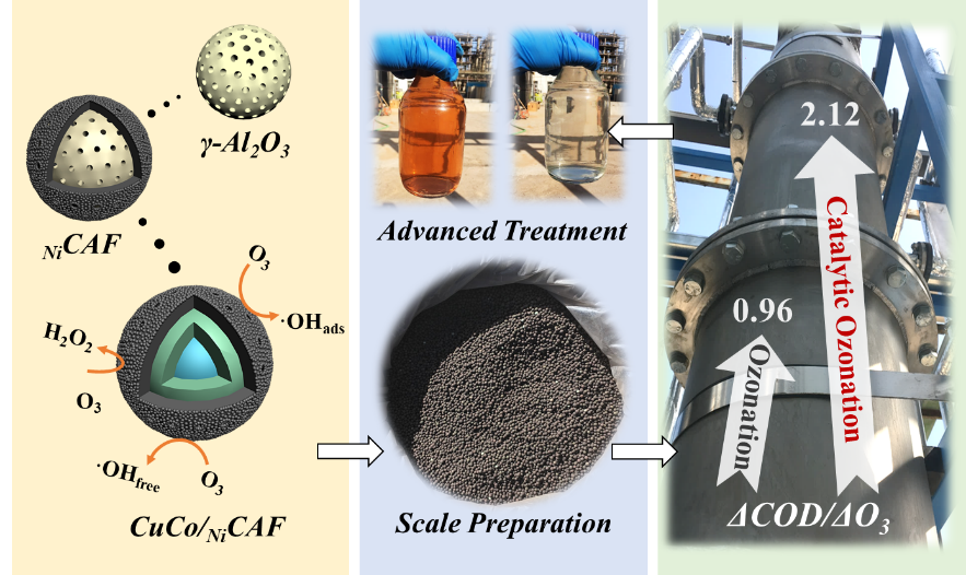 在催化臭氧化過程中,Al 2 O 3負載的催化劑通常具有穩定的結構但表面活性相對較低,而碳載催化劑則相反。為了促進它們的協同作用,我們設計了一種Ni誘導的C-Al 2 O 3框架(Ni CAF)并用Cu-Co雙金屬加強它以產生具有核 - 多殼結構的有效催化劑(CuCo / Ni CAF)。與Ni晶體相鄰的碳的部分石墨化在催化劑表面上形成強外殼。CuCo / Ni CAF 總有機碳去除速率常數(0.172±0.018 min -1)比Al 2 O 高67%和310%分別為3-載體催化劑和Al 2 O 3。CuCo / Ni CAF 上的金屬有助于催化臭氧化過程中的表面介導反應,而嵌入的碳增強了固 - 液邊界層和本體溶液中的反應。此外,與Al 2 O 3負載的催化劑相比,碳嵌入使得·OH-生產效率提高76%,有機吸附能力提高86%。在長期處理煤氣化廢水(~5 m 3 day -1)期間,CuCo / Ni的中試規模示范CAF-催化臭氧化揭示了臭氧的利用效率(ΔCOD/ΔO增加120%3相比,純臭氧化(0.96)的= 2.12)。這些發現突出了Ni CAF 上支持的催化劑,作為實現高催化活性和優異結構穩定性的簡便有效方法,證明它們在實際應用中非??尚?。