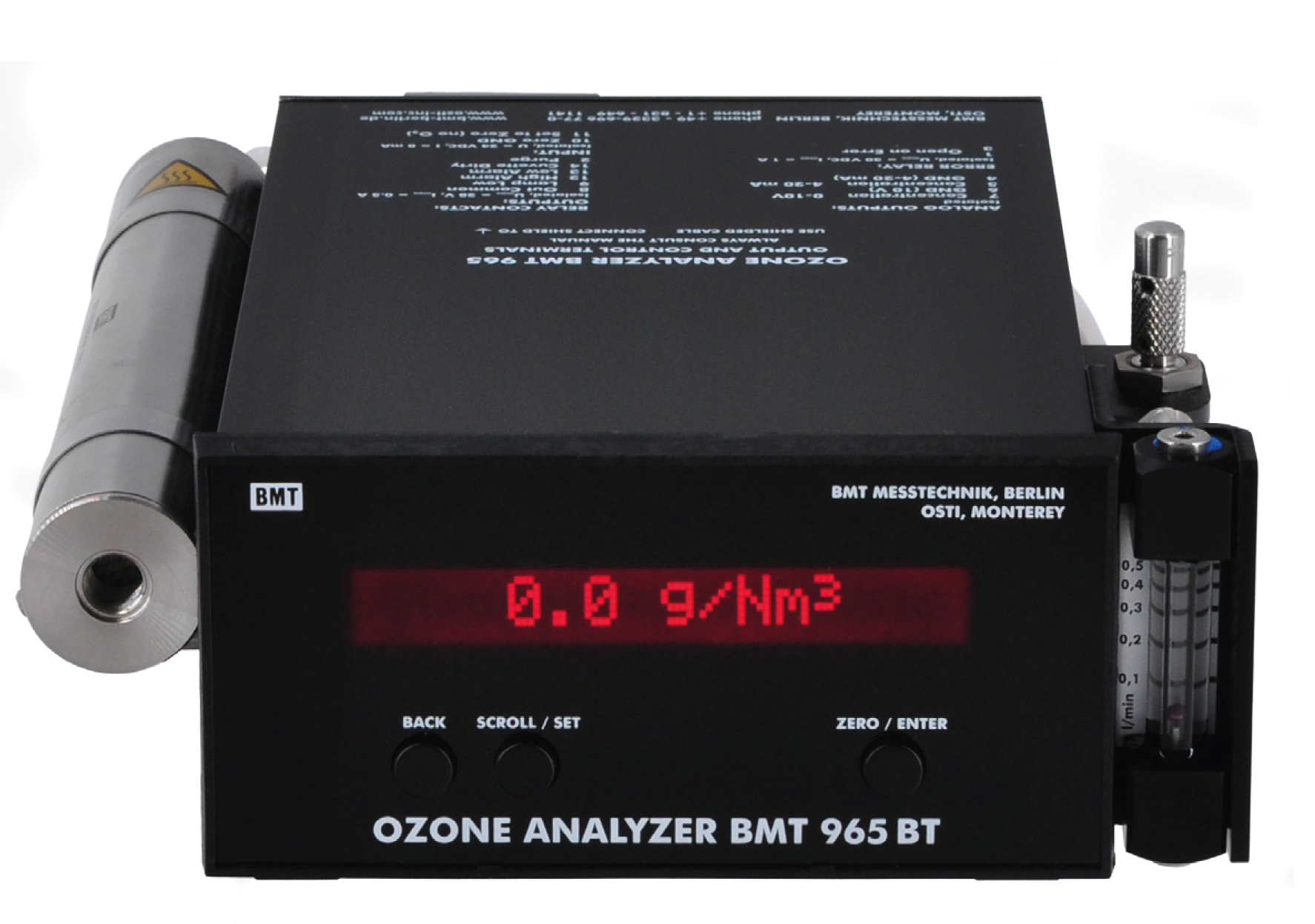 BMT 965特征- 雙光束紫外光度計- 長壽命水銀燈- 保修3年,紫外線燈5年- 高精度,誤差不超過0.5%- 壓力和溫度補償- 全量程從2至600g / Nm3- 內置樣氣過濾器- 可選配內置吹掃單元- 繼電器觸點控制自動歸零- 故障警告包括:光度不足,樣品槽污染,超出量程,錯誤總結- 可通過前面板或Windows PC編程關鍵功能- 顯示單位為g / Nm3,%wt / wt或ppmv- 高/低限報警- 計時設置自動歸零- 壓力讀數以bar,psi,Torr或MPa為單位- 4-20mA和0-10V隔離輸出- RS-232接口(雙向)BMT 965參數