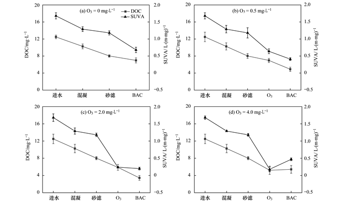 對不同的臭氧濃度條件下沿程出水的DOC和SUVA進行測定, 結果如圖 1所示。